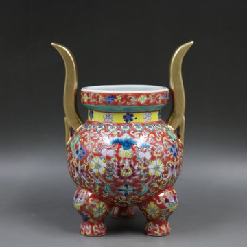 古玩陶瓷器收藏 乾隆年制底款 仿古瓷器粉彩纏枝蓮花卉紋三足香爐