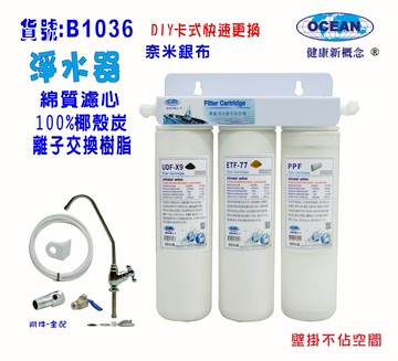 工廠直營專業免費安裝技術咨詢/! 品名: DIY快速更換卡式管3淨水器 ***經濟部標準檢驗局商品驗證 登入書證書號碼 CI 7 5 3063340035號 00*** 功能可濾除大於萬分之一公分的雜質、微生物、浮游物、孢囊菌、石棉纖維、異味、異色、餘氯、漂白水、三鹵甲烷、致癌物等有毒污染物: (5 micron) .去除鎂鈣水垢 最高耐壓:125PSI 適用對象:商業用、家庭用 組合淨水器機組 第一道 卡式棉質濾心過濾孔徑微米PP----(5) 第二道 卡式英國PUROLITE離子樹脂(去除水垢) 第三道 卡式100%椰殼炭活性炭濾心 配件:分鵝頸龍頭、吊片、分考克、分進水三通、濾殼把手管米2白鐵鵝頸吊片24PE6