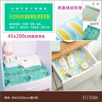 日式時尚防潮廚櫃墊(厚版亮面) 1. 特色:居家抽屜,衣櫥,鞋櫃,書櫃,餐桌,廚櫃.........都可使用,可有助隔離細菌,防潮........ 2. 款色:玉米/咖啡杯 3. 尺寸: 約寬45X長200CM 4. 材質: 珍珠棉+聚丙烯