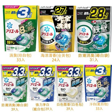 【超商最多寄送5包,若超出以上數量或加購其他商品,請選擇宅配寄送】 【超商最多寄送5包,若超出以上數量或加購其他商品,請選擇宅配寄送】 日本P&G ARIEL BOLD 3D抗菌除垢洗衣膠球 補充包 水量65公升以下或衣服6公斤以下衣物,只要一顆就可以清洗乾淨! ▼▼各種香味用途▼▼ BOLD 桂花清香(淺藍袋) 39顆裝 #63748 BOLD 牡丹花香(粉色包) 39顆裝 #62505 BOLD 洗衣凝膠球 牡丹香 17顆裝(金蓋粉盒裝) #61879 ARIEL 洗衣凝膠球 (26顆袋裝) 運動版史上最強消臭洗淨#34537 ARIEL 3倍!33顆 #94787藍白包-洗衣凝膠球 ARIEL 3倍!33顆 #94626綠白包-洗衣凝膠球 ARIEL 3倍!33顆 # 94787藍色包-洗衣凝膠球 P&G BOLD 4D 洗衣膠球 粉色牡丹花香11顆 #40180 P&G BOLD 4D 洗衣膠球 白葉花香11顆 #40258 P&G BOLD 4D 洗衣膠球 薰衣草、花園香11顆 #08913 P&G BOLD 4D 洗衣膠球 柑橘 & 馬鞭草香11顆# 84764 ARIEL 3.3倍!36顆 #40203粉紅包-洗衣凝膠球 ARIEL 3.3倍!36顆 #40296淺藍包-洗衣凝膠球 ARIEL 3.3倍!36顆 # 08975紫色包-洗衣凝膠球 ARIEL 2.8倍!31顆 #34728綠白包-洗衣凝膠球 BOLD 2.7倍!30顆 #64596粉紫包-洗衣凝膠球 ARIEL 2.7倍!24顆 #84549金黃包-洗衣凝膠球(海洋清香) P&G BOLD 4D 洗衣膠球 牡丹花香 補充裝28顆 #92612 P&G BOLD 4D 洗衣膠球 新鮮的花香 補充裝28顆 #92643 P&G BOLD 4D 洗衣膠球 白色薰衣草 & 茉莉花香 補充裝27顆 #92407 產地:日本 包裝:11入、17入、24入、26入、30入、31入、33入、36入、39入、28顆、27顆 用途:衣物清潔 注意事項: -勿直接陽光照射 -請勿食用 -放置陰涼乾燥處 -使用時膠囊請勿剪破,直接將膠囊一同與衣物丟入 -不建議用於洗衣外用途使用