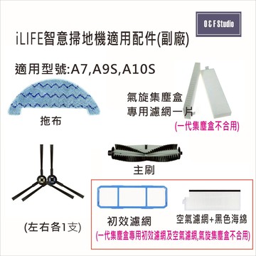 iLIFE智意掃地機適用配件(副廠) 適用型號 : A7 A9S A10S A. 三腳邊刷(左右各1支) 1. 尺寸:刷長57mm 重量:11g 3. 材質 : 塑料 4. 價格 :$115/組 (副廠) ------------------------------------------------------------------------- B. 空氣濾網+黑色海綿(各1片) 1. 尺寸:142*47mm 重量:9g 2. 材質 : HEPA過濾紙 / 塑料 3. 價格 :$80/件 (副廠) 請注意: 氣旋集塵盒不可使用(A10S不可用) ------------------------------------------------------------------------- C. 氣旋盒專用濾網(1片) 1. 尺寸:150*40mm 重量:9g 2. 材質 : HEPA過濾紙 / 塑料 3. 價格 :$135/件 (副廠) 請注意: 一代氣塵盒不可使用 ------------------------------------------------------------------------- D. 主刷 1. 尺寸:長160 mm 重量:48g 2. 材質 : 金屬 / 塑料 3. 價格 :$180/件 (副廠) ------------------------------------------------------------------------- E. 拖布 1. 尺寸:300*100 mm 重量:21g 2. 材質 : 滌淪纖維 3. 價格 :$95/件 (副廠) ------------------------------------------------------------------------- F. 初效濾網(A10S不可用) 1. 尺寸:158*50mm 重量:9g 2. 材質 : 塑料 3. 價格 : $120/件 (副廠) -------------------------------------------------------------------------