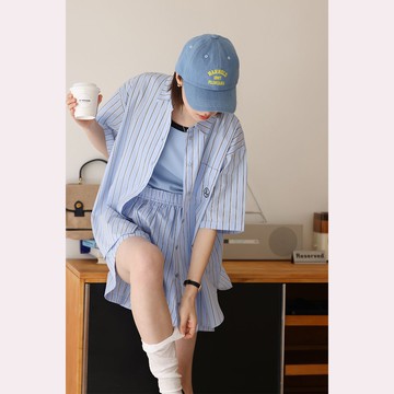 短袖套裝條紋刺繡短袖襯衫時尚百搭女松緊腰短褲兩件套【聚寶屋】