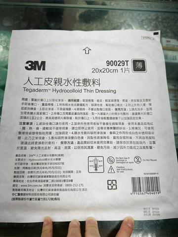 3M人工皮親水性敷料 20*20/1入 "薄"款 一盒10入 醫療器材許可證所載品名:3M人工皮親水性敷料(滅菌) 醫療器材許可證所載核准字號:衛部醫器製壹字第006007號 醫療器材許可證所載藥商名稱:台灣明尼蘇達礦業製造股份有限公司 製造廠名稱:宇仁醫療器材科技股份有限公司頭份廠 製造廠地址:苗栗縣頭份市蘆竹里蘆竹路172號 藥商許可執照所載藥商名稱:銓鴻醫療器材有限公司 藥商地址:台中市豐原區安康路105號 藥商許可執照字號:中市藥販 字第6236015399 號 產品製造日期:詳見包裝標示及說明 有效期間或保存期限:詳見商品包裝標示及敘述