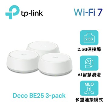 商品規格 最新 WiFi 7 BE5000 雙頻Mesh路由器,3入裝 雙2.5G連接埠,AI智慧漫遊 一鍵換機,訊號覆蓋約115坪 完整支援802.11k/v/r,提供最好的無縫漫遊體驗 透過 Deco app 即可輕鬆管理、設定 內建四天線,三年保固,一年換新 4,324 Mbps (5 GHz) + 688 Mbps (2.4 GHz) 內建 2X2.5Gbps連接埠,提供更快的有線連接 商品說明 TP-Link|Deco BE25 WiFi 7 BE5000 Mesh 無線網路網狀路由器|三入組 ※ 以上商品介紹規格與原廠贈品依各品牌官網公告為主,本商品頁訊息僅供參考,若原廠修改規格或贈品活動內容,詳細內容請查閱各品牌官網。以原廠規格所公布資料為準,如有變更,將不另行通知。 ★7天猶豫期非試用期,7天內尚未決定是否購買本商品,切勿拆封與破壞原廠外盒包裝。 ★商品一經拆封或使用,等同商品價值已受損,僅能以福利品出售,若非商品本身瑕疵而需退換貨,須收取價值損失之費用(回復原狀、整新費、安裝配送費等,約商品售價的10~30%不等之費用),請先確認訂購商品無誤,再行開機/使用,以免影響您的權利,祝您購物順心。(如原廠判定為人為損壞,本公司有權拒絕退換貨申請) ★若因產品故障要退換貨商品,必須為無髒汙、無損傷之狀態且包裝完整(含商品主機、包裝內外盒不得刮傷破損,配件/隨附文件與贈品不得缺件)。 ★若因新品故障要退換貨商品,新品瑕疵判斷將由原廠工程人員檢測。如對收到商品有疑慮,建議開箱過程全程錄影,以確保自身權益。 ★如需施工團隊特殊配送或安裝的大型家電(電視、冷氣、冰箱、洗衣機等)收到消費者付款之訂單需求後,將會派發給運送與施工團隊,當派單完成後,訂單狀態為出貨中,此狀態不一定是實際完成出貨,僅代表發單至施工團隊,實際以施工團隊與訂購者電話約裝的內容為主。 在3-5天工作天內,施工廠商將進行聯絡之約裝動作。 ★遊戲片(含軟體)商品一經拆封視同購買,無法退換貨。 ★遊戲主機與配件一經拆封,若非新品瑕疵、故障不良,仍堅持退貨將酌收兩成~五成包裝復原整新費。 ※對於遊戲主機與遊戲片商品(含軟體)有任何疑問,請先不要拆封,試玩,請儘速向客服反應。 ※ 賣場商品與形象情境圖僅供參考,以實際出貨商品為主 ※ 出貨提醒:如遇不可抗外力,例如颱風、豪雨、工廠或海運空運罷工等天災與其他難以抗拒的人為事件,致使貨運公司未上班營運,網購商品將會延後出貨。 NCC編號:CCAH24LP6560T3 BSMI編號:D38330