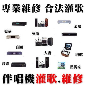 【E平台 灌歌維修服務】 各廠牌卡拉OK伴唱機灌歌維修、擴大機.音響器材維修 台北 基隆 宜蘭 花蓮 台東 桃園 新竹 苗栗 台中 彰化 雲林 嘉義 台南 高雄 屏東 澎湖 金門 馬祖 皆可服務 卡拉OK伴唱機維修修理 點歌機點唱機修理 卡拉OK伴唱機灌歌 點唱機點歌機灌歌維修 外縣市可宅配收送服務,請來電洽詢:02-28958611 (另有舊機換新機活動!立即折抵1000-5000元) 各廠牌卡拉OK點歌機/點唱機 灌歌: 金嗓 音圓 美華 點將家 大唐 啟航 順風九九 伴唱機 合法版權 灌歌服務 各廠牌卡拉OK點唱機/點歌機 維修: 金嗓 音圓 美華 點將家 大唐 啟航 順風九九 伴唱機 各大廠牌伴唱機維修整理、點歌機維修、點唱機維修保養 家庭劇院、擴大機、混音器、無線麥克風、音響器材 各類型音響組合維修整理 【台北 基隆 桃園 宜蘭 花蓮 新竹 苗栗 台中卡拉OK伴唱機灌歌維修】金嗓 音圓 美華 點將家 大唐 啟航 順風九九點歌機/點唱機 灌歌維修 合法版權 另提供 伴唱機 音響器材出售/出租服務 專業主持人.那卡西伴奏.外場活動表演 服務 洽詢專線: 02-28958611