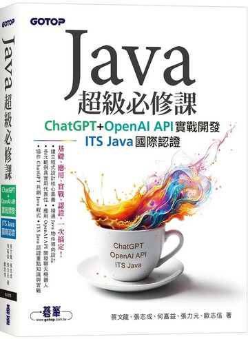 【簡介】 ChatGPT × OpenAI API 加持,學習、開發、認證一次到位! 扎實Java程式設計訓練,搭配ChatGPT學習,開發OpenAI API聊天機器人;培養程式設計與運算思維能力,為您打下輕鬆考取ITS Java國際認證能力。 ※資深教師聯合編撰 由OCJP與ITS Java認證講師、科技大學教授Java程式設計資深教師共同編著,針對目前初學者學習Java程式設計必備技能所撰寫的教材。 ※多元內容實用範例 內容由Java程式設計流程控制、陣列、方法、物件導向程式設計、介面與泛型、多執行緒、例外處理、檔案處理、Lambda運算式、Swing視窗應用程式。並附上拉霸遊戲機與記憶大考驗專題電子書供初學者練習。每個單元由淺入深、循序漸進、範例貼近日常生活,讓初學者能學以致用。 ※ChatGPT協作開發 × OpenAI API聊天機器人實戰 第16章帶你掌握ChatGPT的特色與應用,實際操作如何透過對話生成程式碼,並與ChatGPT協作開發Java專案。 第17章手把手示範OpenAI API申請與使用,帶你打造專屬的Java聊天機器人應用程式。 ※ITS Java實例導入與國際認證能力訓練 內文融入Certiport ITS Java解題技巧,書末更附上兩組模擬試題,完整對應國際認證需求,讓初學者的程式設計訓練更加扎實,同時也是教師培訓學生考取ITS Java國際認證的最佳教材。 ※更多新知可訂閱「程式享樂趣」YouTube頻道www.youtube.com/@happycodingfun 【目錄】 第1 章 Java 概述 1.1 Java 的興起 1.2 Java 的特性 1.3 安裝 Java SE 1.4 使用記事本編寫Java 程式 1.5 安裝 Eclipse 1.6 在 Eclipse 整合開發環境下編寫Java 程式 1.7 Java 程式架構 1.8 建立說明文件檔 1.9 認證實例演練 第2 章 資料型別與運算子 2.1 識別字與關鍵字 2.2 基本資料型別 2.3 變數與常數 2.4 運算子與運算式 2.5 Java 資料型別的轉換 2.6 基本資料型別與參考資料型別 2.7 主控台輸入與輸出 2.8 認證實例演練 第3 章 控制敘述 – 選擇 3.1 前言 3.2 if 選擇敘述 3.3 switch 多重選擇敘述 3.4 認證實例演練 第4 章 控制敘述 – 重複 4.1 重複敘述 - for 迴圈 4.2 重複敘述 - while 和 do…while 迴圈 4.3 分支敘述 4.4 認證實例演練 第5 章 陣列 5.1 前言 5.2 陣列的宣告及使用 5.3 多維陣列 5.4 陣列的排序與搜尋 5.5 認證實例演練 第6 章 方法(Method) 6.1 前言 6.2 方法 6.3 傳值呼叫與參考呼叫 6.4 方法間傳遞陣列引數 6.5 方法多載 6.6 遞迴 6.7 認證實例演練 第7 章 物件與類別 7.1 物件導向程式設計概述 7.2 類別與物件的關係 7.3 方法多載 7.4 建構式 7.5 靜態成員 7.6 this 參考自身類別 7.7 認證實例演練 第8 章 繼承 8.1 繼承 8.2 方法覆蓋 8.3 預設建構式的繼承 8.4 使用 super 8.5 使用 final 8.6 靜態成員的限制 8.7 抽象類別與抽象方法 8.8 認證實例演練 第9 章 介面與多型 9.1 介面 9.2 多型 9.3 套件 9.4 認證實例演練 第10 章 例外處理 10.1 例外 10.2 例外處理 10.3 Java 常用的內建例外類別 10.4 自行拋出例外 10.5 自定例外類別 10.6 認證實例演練 第11 章 I/O 常用類別 11.1 Java I/O 處理 11.2 File 類別 11.3 檔案讀取類別 11.4 檔案寫入類別 11.5 二進位檔讀取類別 11.6 二進位檔寫入類別 11.7 認證實例演練 第12 章 集合與泛型 12.1 集合物件 12.2 Collection 介面 12.3 Set 介面與 HashSet 類別 12.4 SortedSet 介面與 TreeSet 類別 12.5 List 介面與實作類別 12.6 Map 介面與 HashMap 類別 12.7 SortedMap 介面與 TreeMap 類別 12.8 Collections 集合工具類別 12.9 集合的走訪器 12.10 認證實例演練 第13 章 多執行緒 13.1 執行緒簡介 13.2 執行緒的生命週期 13.3 如何建立執行緒 13.4 Thread 類別常用的方法 13.5 執行緒的同步(Synchronized) 13.6 執行緒的等待和喚醒 第14 章 Lambda 運算式 14.1 Lambda 簡介與使用 14.2 Lambda 語法說明 14.3 方法參考 第15 章 Swing 視窗應用程式 15.1 Swing 簡介 15.2 JFrame 類別 15.3 版面配置 15.4 事件處理 15.5 事件來源 第16 章 與 ChatGPT 協作開發 16.1 認識 ChatGPT 16.2 ChatGPT 聊天初體驗 16.3 ChatGPT 協作開發 Java 程式 第17 章 使用 OpenAI API 開發聊天機器人 17.1 OpenAI API 服務申請 17.2 Java 呼叫 OpenAI API 開發聊天機器人 附錄A ITS Java 國際認證模擬試題 - 1 附錄B ITS Java 國際認證模擬試題 - 2