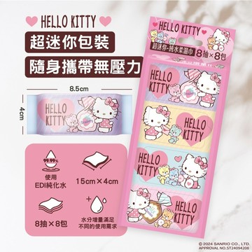 超迷你口袋包 隨身攜帶無壓力 溫和配方零添加 EDI純化水 12 道淨水處理超純淨 純淨度99.99% 飲用也沒有問題 水分增量 滿足不同的需求 Hello Kitty 純水柔濕巾超迷你隨身包-水分增量 主要成分:縲縈水針布、EDI純化水 規格:150mmX140mm(CNS許可差±5%) 數量:8抽X8包、8包/袋 重量:300g±20g 產地:中國 保存期限:3年(係指未開封狀態且正常條件下保存) 使用方法: 撕開包裝密封貼紙,取出濕巾即可使用, 使用完請將貼紙貼回原處,以保持濕潤。 使用方法: 請置於陰涼乾燥處,避免陽光直接曝曬。 注意事項: 不可吞食,孩童請由家長在旁輔導使用。 濕巾不溶於水,請勿丟入馬桶以免堵塞。 濕巾用過請丟棄勿重複使用,確保衛生。 使用後若皮膚有過敏或不適請停止使用。