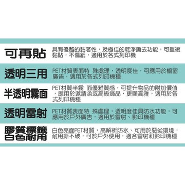 ※龍德標籤貼紙可運用於郵寄信件、大頭貼、外銷紙箱、公文夾管理、產品標示(日期、內容、價格、條碼)等。 ※紙張經特殊處理,使用於噴墨印表機可呈現生動色彩,用於雷射印表機可獲得最佳的列印品質,并採用耐溫膠,可承受列印時的瞬間高溫! ※可使用於各級機關和學校的聯絡名冊,公司行號的客戶資料備存, 以及大量往來郵件寄送,住址張貼,使用方便,可快速影印,縮短作業時間,提高工作效率。 【還在用傳統空白標籤嗎 龍德 彩色標籤紙 是您更好的選擇!!!】 ★方便美觀,節省油墨★ ★適用於各種影印機種、雷射和噴墨列表機,快速列印★ ★採用耐溫膠,可承受列印時的瞬間高溫★ ★輕鬆張貼大量文件,提高工作效率★ ★龍德標籤經SGS認證,不含有毒物質★ ---------------------------------- 電腦標籤→ #勁媽媽商城標籤 門市服務時間:周一至周五 (08:30~18:00) 營業時間:週一至週五(08:30~18:00) 地址:台北市中山區松江路64巷16號 官方line@:@xzv7112l 客服電話:02-2511-5552 #標籤 #貼紙 F2BM3#龍德 #影印 #雷射 #噴墨