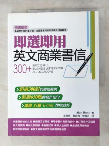 以下書況,主觀上皆可閱讀,若收到後不滿意,『都可退書退款』。 書況補充說明: B 自然泛黃書斑、髒污。 【購買須知】 (1)照片皆為現貨實際拍攝,請參書況說明。 (2)『賣場標題、內容簡介』為出版社原本資料,若有疑問請留言,但人力有限,恕不提供大量詢問。 (3)『附件或贈品』,不論標題或內容簡介是否有標示,請都以『沒有附件,沒有贈品』為參考。 (4)訂單完成即『無法加購、修改、合併』,請確認品項、優惠後,再下訂結帳。如有疑問請留言告知。 (5)二手書皆為獨立商品,下訂即刪除該品項,故『取消』後無法重新訂購,須等系統安排『2個月後』重新上架。 (6)收到書籍後,若不滿意,或有缺漏,『都可退書退款』。 [商品主貨號] U102381503 [ISBN-13碼] 9789571154299 [ISBN] 9571154296 [作者] 王淑惠, AlanBond [出版社] 五南 [出版日期] 2009-01-08 [內容簡介] (出版商制式文字, 不論標題或內容簡介是否有標示, 請都以『沒有附件、沒有贈品』為參考。) 你還在為寫作商業書信傷腦筋嗎? 求職找工作寫不出英文履歷嗎?翻開本書,所有的問題馬上迎刃而解!不論是下訂單、寫催繳函、新聞稿、電子郵件、傳真、祝賀函、邀請函、會議記錄、商業報告…或是寫履歷及求職信,本書都有最適合的範例提供參考。新時代全方位的商業書信參考書。 本書特色: ☆快速解決 寫作問題 300封以上的商業書信即選即用 ☆常用語句 實用適當 650個以上的寫作佳句靈活替換 ☆書信格式 解說詳細 解說寫作目的 輕鬆掌握寫作技巧 ☆隨書附贈:最容易犯錯的單字表、各國國名列表及美國各州縮寫表 ---------------------------------------------------------------------------------------------------- 分享閱讀 書籍狀態請詳看圖示 如對商品有疑問請使用「聯絡店家」發問,發問時請告知完整商品名稱 ■客服電話服務時間: 敝店客服電話 (02) 85316044 服務時間為週一至週五 09:00-12:00 及 13:00-17:00,例假日與國定假日公休 其餘時間請使用 聯絡店家 功能聯繫 。 由於敝店為多平臺同步販售,來電請務必告知為樂天買家以節省您的寶貴時間,謝謝您。 ■其他注意事項: 建議可多利用7-11取貨付款,可在自己方便的時間領貨。