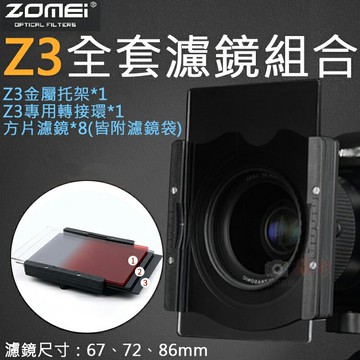 【產品介紹】 品 牌:ZOMEI 產品名稱:卓美Z3全套濾鏡組合 鏡片材質:優質光學樹脂 鏡片厚度:0.2cm 濾鏡尺寸:67mm、72mm、86mm ★下單請確定選擇正確的濾鏡尺寸★ 套裝包含: 01.漸變橙濾鏡片*1 02.漸變藍濾鏡片*1 03.漸變紅濾鏡片*1 04.全灰ND4減光鏡*1 05.全灰ND8減光鏡*1 06.漸變灰ND4減光鏡*1 07.漸變灰ND8減光鏡*1 08.漸變灰ND16減光鏡*1 09.Z3濾鏡卡座*1 10.Z3專用轉接環*1 (方片濾鏡尺寸:約100mm*150mm) ★本賣場為Z3全套濾鏡組合,另有Z1及Z2賣場,可至賣場選購★ ★本賣場卓美Z3全套濾鏡組合,另有販售卓美Z3專用轉接環、卓美Z3金屬托架+接環、卓美方片濾鏡及卓美16片方形濾鏡包,歡迎至賣場選購★ 【安裝方法】 方法一: 1.將托架兩邊旋扭轉鬆 2.將接環放進托架,鎖緊旋鈕 3.將托架旋入鏡頭,將圓形濾鏡轉入 4.插入卓美方片濾鏡 方法二: 1.直接將接環旋入鏡頭 2.轉鬆托架兩邊旋鈕,將托架卡進接環 3.將圓形濾鏡轉入 4.插入卓美方片濾鏡 Q&A Q:Z1、Z2、Z3區別為何呢? A: Z1-可裝2片方型鏡片 Z2-可裝2片方型鏡片或1片方型鏡片及1片超薄框圓型鏡片 Z3-可裝3片方型鏡片或2片方型鏡片及1片超薄框圓型鏡片 ●退換貨須知: ※商品到貨隔日享7天鑑賞(猶豫)期之權益【鑑賞(猶豫)期非試用期】,辦理退貨商品必須是全新狀態且包裝完整,否則將會影響退貨權限※ ※網頁商品會因為使用不同的品牌螢幕以及解析度不同,造成圖片顏色呈現略有不同,請以實品顏色為準※ ※貼心小提醒,商品如經:使用或拆解以致缺乏完整性且失去再販售價值時,恕無法退(換)貨。※