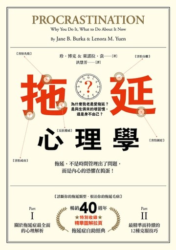作者:珍‧博克(Jane B. Burka), 萊諾拉‧袁(Lenora M. Yuen) 譯者:洪慧芳 出版社:漫遊者文化 出版日期:2023/07/17 語言:中文 ISBN:9789864898237 檔案格式:EPUB3-流式格式 閱讀裝置:閱讀器, Android應用程式, iOS應用程式 診斷你的拖延類型,根治你的拖延毛病 40年讀者口碑 ╳ 拖延症自助經典 關於拖延症最全面的心理解析、最精準而持續的12種克服技巧 拖延,不是時間管理出了問題,而是內心的恐懼在搗蛋! 拖延,有時候反而是害怕成功! 拖延,其實是你害怕被人看穿的煙幕彈! 拖延,已經變成你刻意反抗權威的手段! 愛拖延的人,常常是完美主義者! 你對時間的主觀感覺,是不是與別人不同? 為什麼你什麼都願意做,就是不願做這件事? 真的有「拖延基因」嗎? 拖延,就像是個不離不棄的麻煩精,但如果你不曉得自己為什麼會拖延,世上任何的實用方法都幫不了你。讓頂尖心理學專家幫助你,克服拖延的痼疾,邁向心理成長、自我接納、付諸行動! 從學生到科學家,從祕書到總裁,從家庭主婦到業務員,拖延問題幾乎影響了每個人。本書由兩位傑出心理學家以他們備受好評與創新的拖延治療課程為基礎,擷取他們豐富的諮詢經驗,以詳盡且幽默的方式,深入檢視與探索拖延的心理,並找出讓我們擱著事情不做的真正原因,像是對失敗、成功、控制、疏遠、依附的恐懼,以及我們的時間觀念和大腦神經科學等因素,教我們了解拖延的衝動,以及如何以全新的方式採取行動。 而本書第二部,則以一整套經過驗證的實用課程,教人如何達成目標、管理時間、尋求支援、應付壓力,從而克服拖延的心理。本書並提供不少實用的建議,教大家如何與拖延者共事和生活,更提供父母處理孩子拖延問題的妙方。本書內容實用有效,是想避免拖延的人當下就該閱讀的好書。千萬別拖到改天才讀! 為什麼你總是擺脫不了拖延的壞習慣? 趕快檢查一下,你是否有以下的「拖延心理」: 【佳評推薦】 ․「想改掉拖延的惡習嗎?這兩位加州的心理學家從治療拖延者的實務中,找到了幾個根本的原因。」──《今日美國》 ․「探索造成拖延的原因,以及多種拖延的型態……相當精采!」──《健身》雜誌 ․「博克和袁兩位博士讓拖延者覺得好過一些……拖延者在學習克服拖延的技巧後,除了績效變好,更享受生活以外,也得到許多額外的好處。」──《紐約時報》 ․「拖延可能對生活的每個面向都有致命的影響……博克和袁為習慣拖拖拉拉的人帶來了希望。」──《波士頓先鋒報》 ․「本書所要傳達的根本訊息是:做事遲緩的傾向既非惡習,也不是品格缺失,而是一種由恐懼引發的心理症候群。」──《美國新聞與世界報導》 ․「作者筆觸幽默溫馨,條理分明,馬上就提出臨床有效的治療方法,毫不拖延。」──《檀香山星報》 ․「作者覺得拖延並非懶惰造成的,對有些人來說,那比較像是一種心理障礙,使他們無法做該做的事情。」──《聖荷西信使報》 ․「如果拖延已經讓你失去理智,本書有一些實用的工具可供你參考。」──《奧克蘭論壇報》 ․「細探拖延的心理……最實用的部分是作者教拖延者如何戒除拖延的惡習……這本精采好書肯定可以幫助浪費時間與逃避任務的人改善自我。」──《出版人週刊》 ․「精采的綜合論述……作者提出實用的建議,也教我們如何因應生活周遭的拖延者。」──《圖書館期刊》 ․「我們為什麼會搬出一堆藉口,擱著事情不做?作者解釋這種行為的起因,教我們如何改善。」──《流行商務》雜誌 ․「想停止拖延,提高生產力嗎?現在就讀這本書!」──《職場女性》 作者/譯者簡介 作者簡介 珍**‧博克(Jane B. Burka) & 萊諾拉‧**袁(Lenora M . Yuen) 珍‧博克和萊諾拉‧袁是在舊金山灣區執業的心理醫生,也是美國率先在加州大學柏克萊分校開設拖延團體治療課程的專家。他們上過《歐普拉》和《20/20》等電視節目,《紐約時報》、《今日美國》、《洛杉磯時報》、《時人》雜誌和《當代心理學》等平面媒體也曾報導他們。他們在全美各地爲學生、企業和公衆團體開設治療課程和講習班。 譯者簡介 洪慧芳 國立台灣大學國際企業學系畢業,美國伊利諾大學香檳分校管理碩士,現為專職譯者,從事書籍、雜誌、電腦與遊戲軟體的翻譯工作。 Blog:blog.yam.com/cindybooks 目次 謝辭 作者序 【第一部】 認識拖延 了解自己 第一章 拖延是煩人精,還是頑敵? 是延後,還是拖延? 拖延的苦果:內在煎熬與外在後果 拖延週期 拖延的根源 拖延者信條 第二章 [拖延者①號:害怕失敗型]──適應不良的完美主義者 恐懼失敗:用拖延保持完美 不完美的命運:真實和想像的後果 第三章 [拖延者②號:害怕成功型]──迎接拖延,告別成功的內疚者 你害怕成功嗎? 用拖延抵抗文化壓力,逃避成功 迴避成功的兩大原因:代價過高vs.我不配 第四章 [拖延者③號:反抗權威型]──打破規則的叛逆者 用拖延爭取主控權 拖延是一種獨立宣言 第五章 [拖延者④號:害怕分離型][拖延者⑤號:害怕親近型]──賴在舒適圈裡的黏人精與隱匿者 分離焦慮:拒絕獨行 害怕親近:太親近讓人不自在 第六章 你知道現在幾點嗎? 客觀時間和主觀時間 時間觀念的演進 陷入另一時區 整合過去,迎接「成熟時間」 第七章 現代神經科學的大發現 大發現之一:大腦持續在變 大發現之二:感受很重要,即使你沒意識到 大發現之三:內隱記憶的影響 大