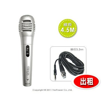 ※ 下單前請先來電洽,確認租賃細節 ※ ================================== .此為租賃賣場 .數量/天數多另有優惠 .檔期請來電確認 .此賣場為自取自還 .需本公司運送,則運費另計 .租金以一天24小時計費 ================================== 產品名稱:(出租) MUD-387 CAROL動圈式有線麥克風 型號:MUD-387 狀態:全新公司貨 顏色:銀 尺寸:動圈式;Ø40mm x168mm 商品介紹: ※ 租賃特惠一支NT100/天(24小時),租賃數量多或多天數租賃另有優惠。 產品特色: ☆ 經濟實惠之款式,簡潔外型設計,音質清晰、原音重現。 ☆ 專利釹鐵錋一體成型音頭。 ☆ 塑膠本體加重。 ☆ 搭配麥克風導線為CAROL原廠型號:PC-518,規格:6.3mm插頭、4.5米(長)、線徑5.5mm,品質耐用。 產品規格: .指 向 性:單一指向性 .頻率範圍:50 - 15000Hz .阻 抗:600Ω ± 30% .頻率範圍:-72 ± 3dB .尺 寸:Ø40 x168mm .重 量:200g .導線線徑:Ø5.5mm .導線長度:4.5M 定價: MUD-387 NT 100/天(24小時) 運費:自取免運費;若需本公司運送,則運費另計,歡迎來電洽詢。 ***下標前請先與我們確認貨源是否充足,如有不便請見諒,謝謝! *** 產品圖文、規格、價格如有錯誤,請以原廠標示及實機為準。 如遇缺貨或停產不及更正,本公司保留出貨與否之權利,十分感謝諒解! 敬請尊重智慧財產權,網頁內所有文字與圖片皆為本公司精心製作,版權所有,盜用必究!! 謝謝! 連接類型: 有線