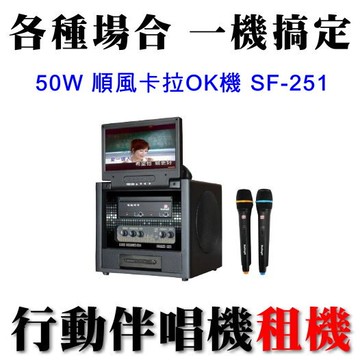 【行動卡拉OK伴唱機出租】 台北 基隆 宜蘭 花蓮 台東 桃園 新竹 苗栗 台中 彰化 雲林 嘉義 台南 高雄 屏東 全省皆可出租 外縣市(宅急便配送) 請在使用日前四天決定,以便安排寄出 租機洽詢專線: 02-28943045 另有各類大小型活動表演統包、舞台車、舞台搭建、燈光 大型音響.伴唱機、展場表演活動設備出租 我們提供電子琴、小提琴、鼓手、吉他、薩克斯風、直笛、二胡、舞群、 歌手、中英文.國台語主持、那卡西老師伴奏等多元外場表演 全省服務 行動卡拉OK出租。輕巧好攜帶,各種場合 一機搞定 租機諮詢專線:(02)2894-3045 適用場合 社區活動/社團聯誼/演講廣播/聚會宴客 婚禮喜宴/會場展售/會議簡報/生日派對 記者會/頒獎典禮/畢業典禮/謝師宴 郊遊爬山 輕巧易攜帶 各種場合,一機搞定! ~免插電、輕巧好攜帶 台灣製造,品質保證~ 伴唱機押金 50W 伴唱機 20000元 50W 伴唱機出租 一天2500元 順風99卡拉OK機 SF-251B 升級款 可外接低音喇叭,效果媲美100W伴唱機 加租低音喇叭,一天只要1000元 取/還機說明 租機日 前一天 中午後 可取機 租機日 後一天 中午前 還機 其他說明事項 台灣本島皆可出租,租機無設限 ↓ 中南部地區歡迎使用 ↓ 取機方式:宅配到府,貨到付款 還機方式:到府取機,匯款退押金 宅配取/還機,需酌收運費及處理費600元 租機好方便,安全有保障 (租機前請先來電洽詢確認) 各式租機問題,歡迎來電洽詢 (02)2894-3045
