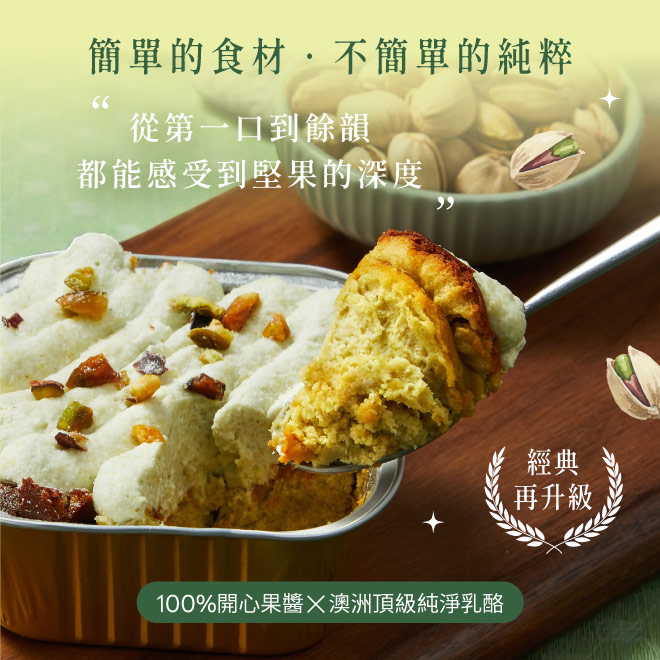 商品中文成分:頂級凝脂乳酪、動物性鮮奶油(乳脂)、新鮮蛋液、蔗糖、開心果醬(開心果)、異麥芽寡糖、低筋麵粉、開心果果仁、梔子綠天然食用色素(麥芽糊精、梔子綠、梔子黃)
