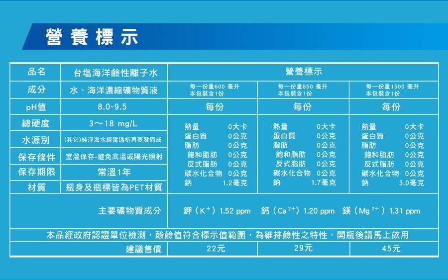名稱:【台鹽】海洋鹼性離子水 600ML x24/箱