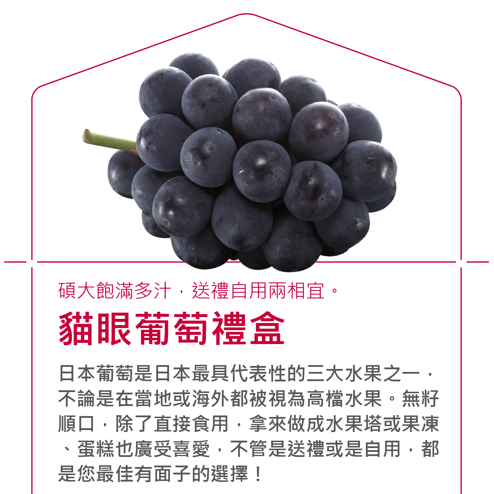 - 日本葡萄早已在世界享譽名聲,其高品質幸福滿足的滋味可謂是世界第一,其中日本的山梨縣是產量最大、岡山縣是全日本葡萄最精華的產地,日本除了"珍珠葡萄"、"御葡萄"等小葡萄之外,其中最具代表與知名度以及最受歡迎的就是非"貓眼葡萄"莫屬了。
