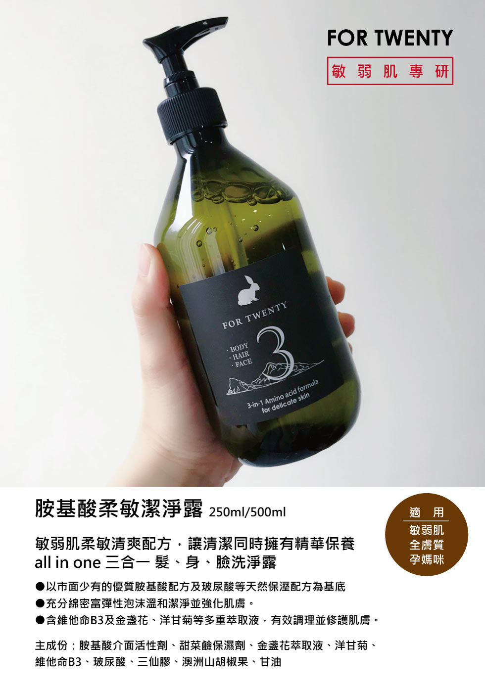 保濕祭》冷氣房保濕!【FOR TWENTY】胺基酸柔敏潔淨露 ♡清潔+保濕+呵護稚嫩肌!輕旅行💝清潔肌膚暢通毛孔❤促進肌膚新陳代謝♥三合一髮、身、臉洗淨露დ 【Shopping99】