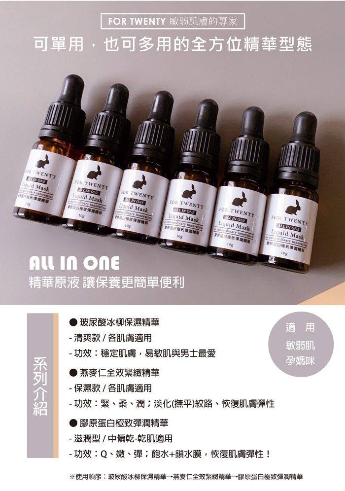 ★獨家配方:原液/All in one系列 高濃度可作為輕乳液 簡單保養新選擇 可單用或加入保養程序中 此款為滋潤型,推薦乾燥肌膚使用。