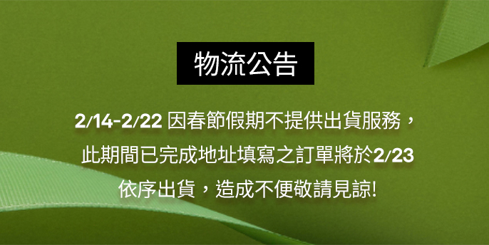 2/14-2/22因春節假期不提供出貨服務,此期間已完成地址填寫之訂單將於2/23依序出貨,造成不便敬請見諒