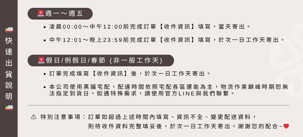 ⚠ 特別注意事項:訂單如超過上述時間內填寫、資訊不全、變更配送資料,則待收件資料完整填妥後,於次一日工作天寄出。謝謝您的配合~❤️