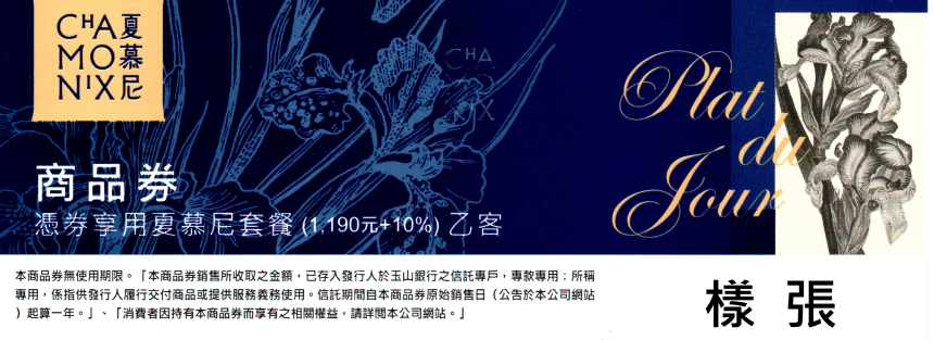 ・本商品券可享內用夏慕尼套餐價$1190元+10%服務費之套餐乙客;本商品券若因季節更替調整菜單或營業型態改變,可兌換等值商品($1190元+10%服務費);若遇套餐價格漲價或點不同價格之套餐,須補足商品券券面抵用金額之差額始能兌換。