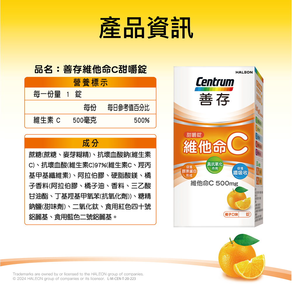3.內容物名稱(成分):蔗糖(蔗糖、麥芽糊精)、抗壞血酸鈉(維生素C)、抗壞血酸(維生素C)97%(維生素C、羥丙基甲基纖維素)、阿拉伯膠、硬脂酸鎂、橘子香料(阿拉伯膠、橘子油、香料、三乙酸甘油酯、丁基羥基甲氧苯(抗氧化劑))、糖精鈉鹽(甜味劑)、二氧化鈦、食用紅色四十號鋁麗基、食用藍色二號鋁麗基。