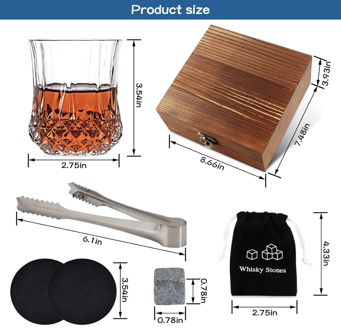 - 理想套裝:我們提供8種功能性威士忌石,2個200ml威士忌酒小玻璃杯,1個天鵝絨袋和一個由精緻木材製成的木箱,這對任何酒吧來說都是一個好主意。