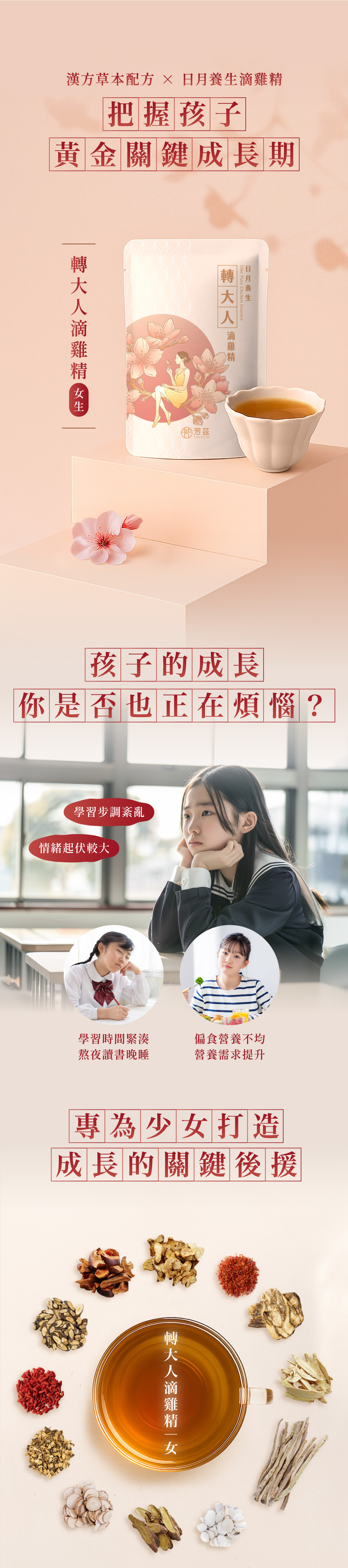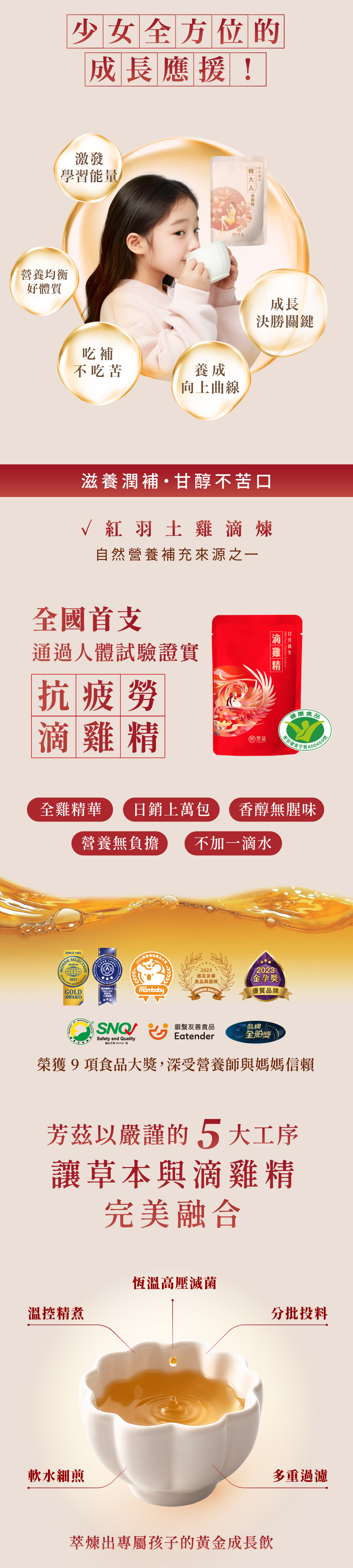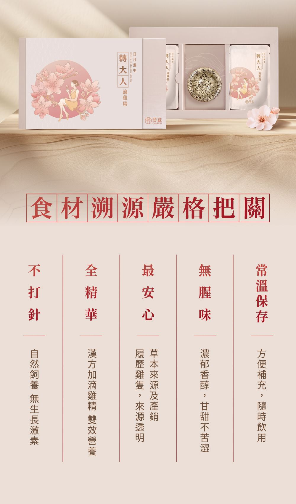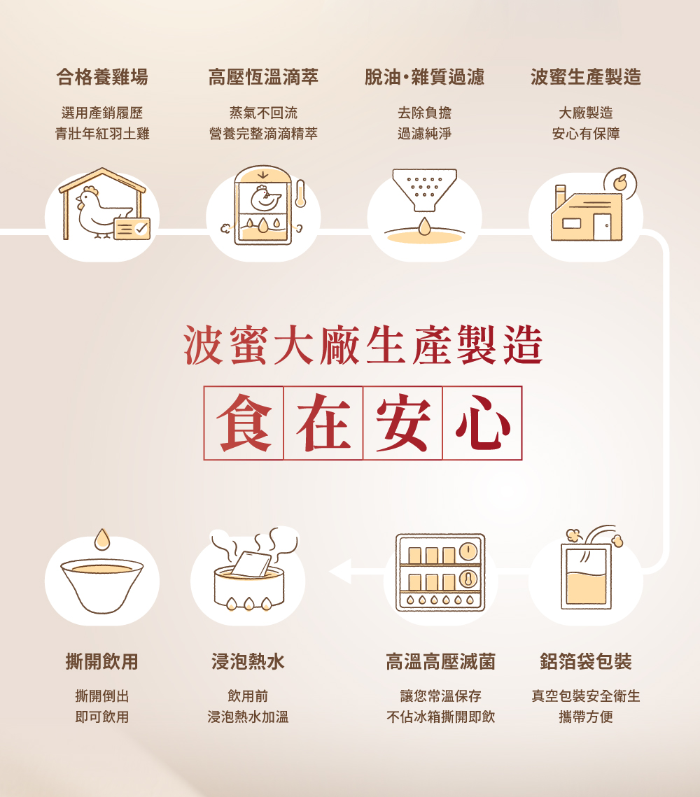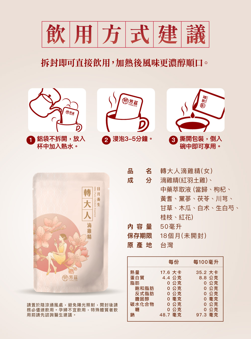 成分:滴雞精(紅羽土雞)、中藥萃取液(當歸、枸杞、黃耆、黨蔘、茯苓、川芎、甘草、木瓜、白术、生白芍、桂枝、紅花)