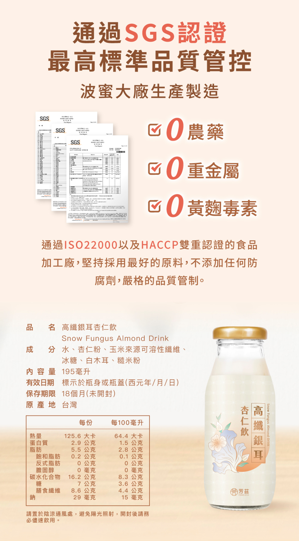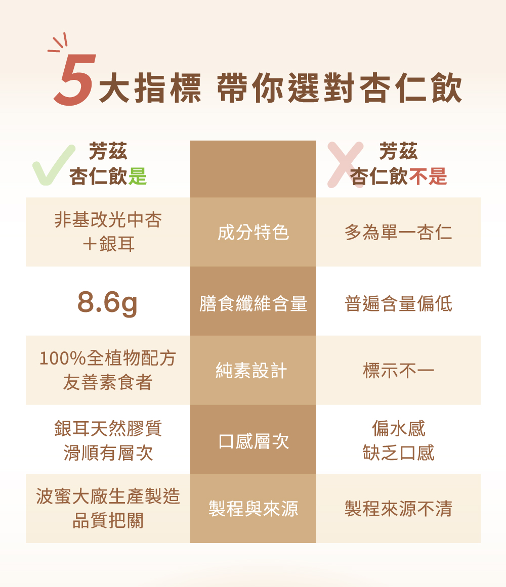 成分:水、杏仁粉、玉米來源可溶性纖維、冰糖、白木耳、糙米粉