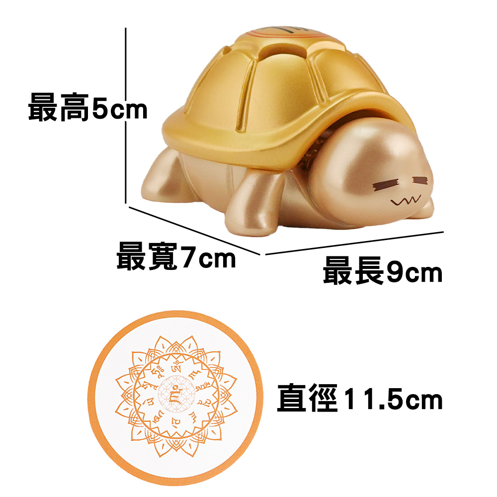黃金發財錢龜x1只:樹脂。整體尺寸約9 cm *7 cm *5cm。重量約140g。內裡洞孔會貼兩層膠可黏自備一元硬幣。