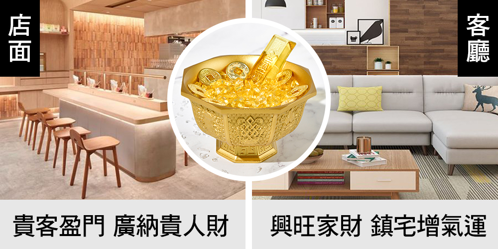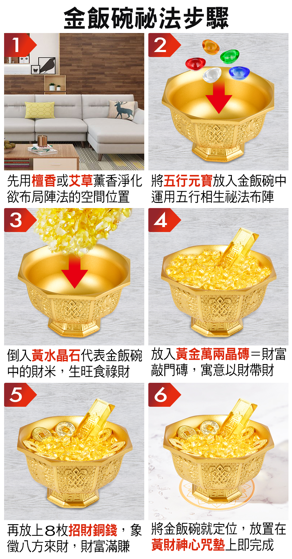 聚寶盆另蘊含獨家開運秘法於其中(1)以《五行元寶》打造相生相旺的循環能量、活絡財氣;(2)碗中的《黃水晶碎石》代表財米、碗中有米才能催旺食祿;(3)《黃晶金磚》象徵財富敲門磚、藉以打開財富之門(4)以八枚招財進寶銅錢封印財庫,讓財富只進不出。另有特別附贈(5)黃財神心咒圓墊,放在金飯碗下方以此結界守護財富根基穩固。金飯碗建議擺放在店面、辦公桌、書桌、客廳等生財位,即可讓您富貴吉運手到擒來! 絕對是旺財風水擺設首選!