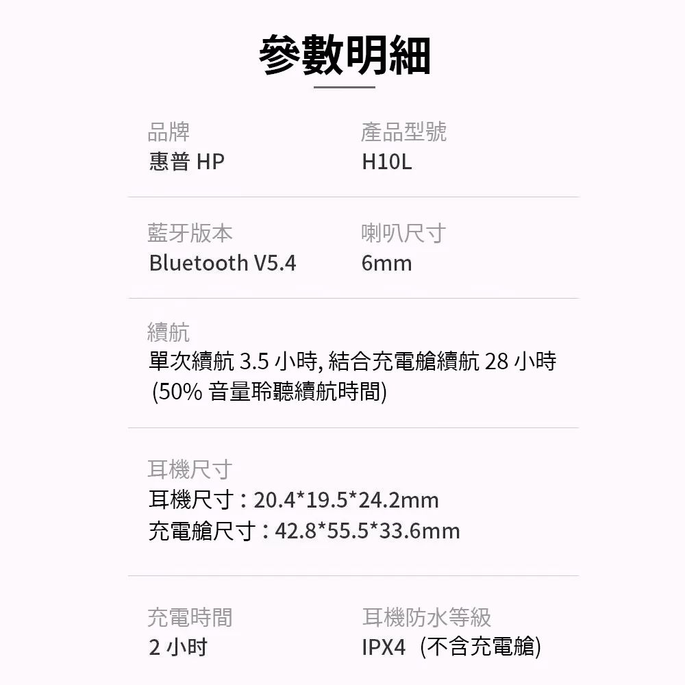 HP 惠普 H10L 輕盈入耳設計,鯊魚鰭耳翼更牢固,淺入耳更舒適,親膚矽膠,佩戴無感,舒適自然。藍牙5.4技術,穩定低功耗、低延遲。IPX4級防水,無懼汗水和雨水。28小時持久續航,全天候陪伴您的每一刻。