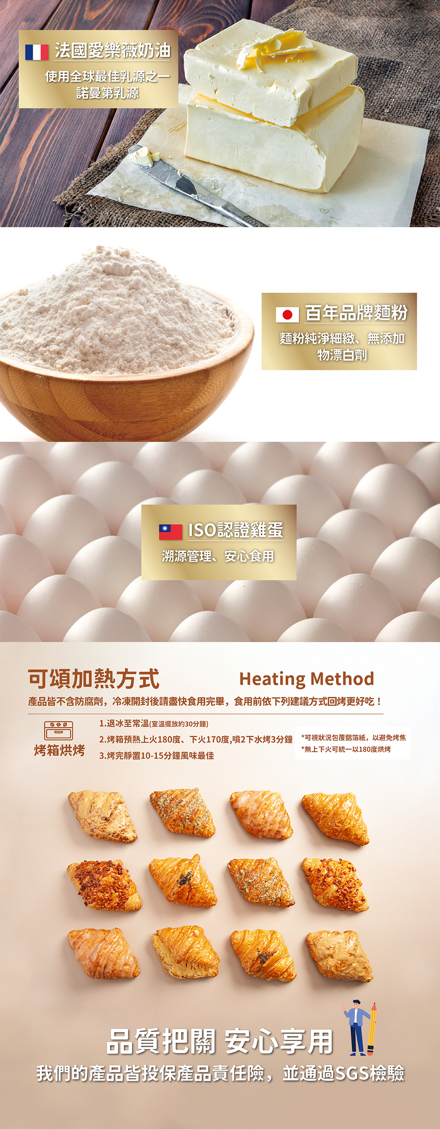 堅持日式職人精神,嚴選世界級優質食材(法國愛樂薇奶油、日本百年大廠麵粉與 ISO認證雞蛋), 呈現天然奶油的清香、 並運用獨門摺層手法 才能擁有外層酥脆誘人、 內層鬆軟細緻的多層次完美口感。