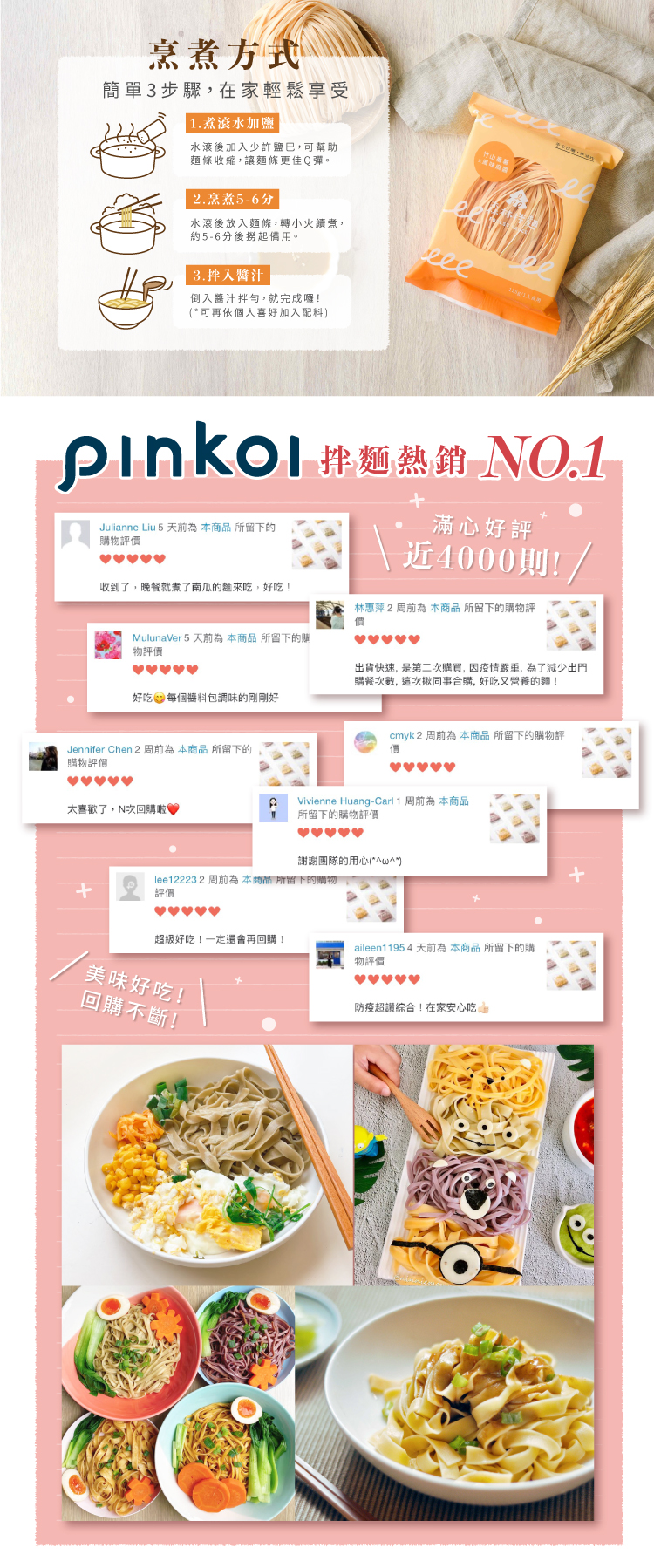➤烹煮的時間短,享受的時間好長 。 帶有嚼勁的寬麵以及柔順的細麵,搭配不同的醬料, 每一碗都是新的感受、新的體驗,醬汁的入味驚艷味覺, 麵條的口感與搭配有百種滋味。