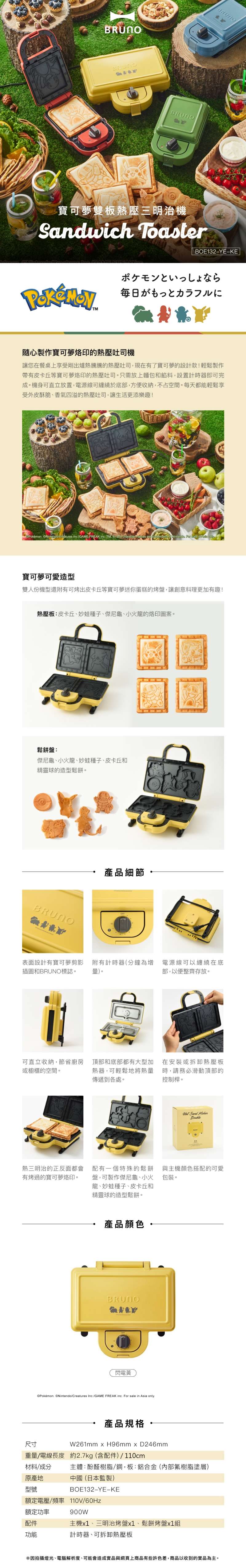 【日本 BRUNO x Pokemon】寶可夢 限定聯名款熱壓吐司機/三明治機/鬆餅機 BOE132