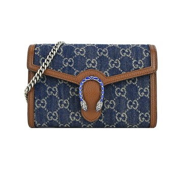 GUCCI 古馳 經典Dionysus系列單寧牛仔虎頭釦銀鍊手拿/斜背包(藍色)