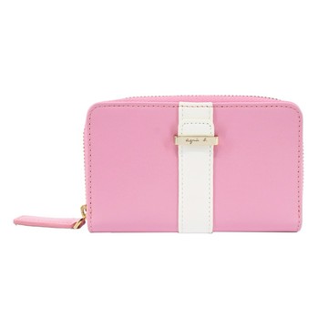 agnes b.皮革直紋飾帶翻蓋短夾-粉紅
