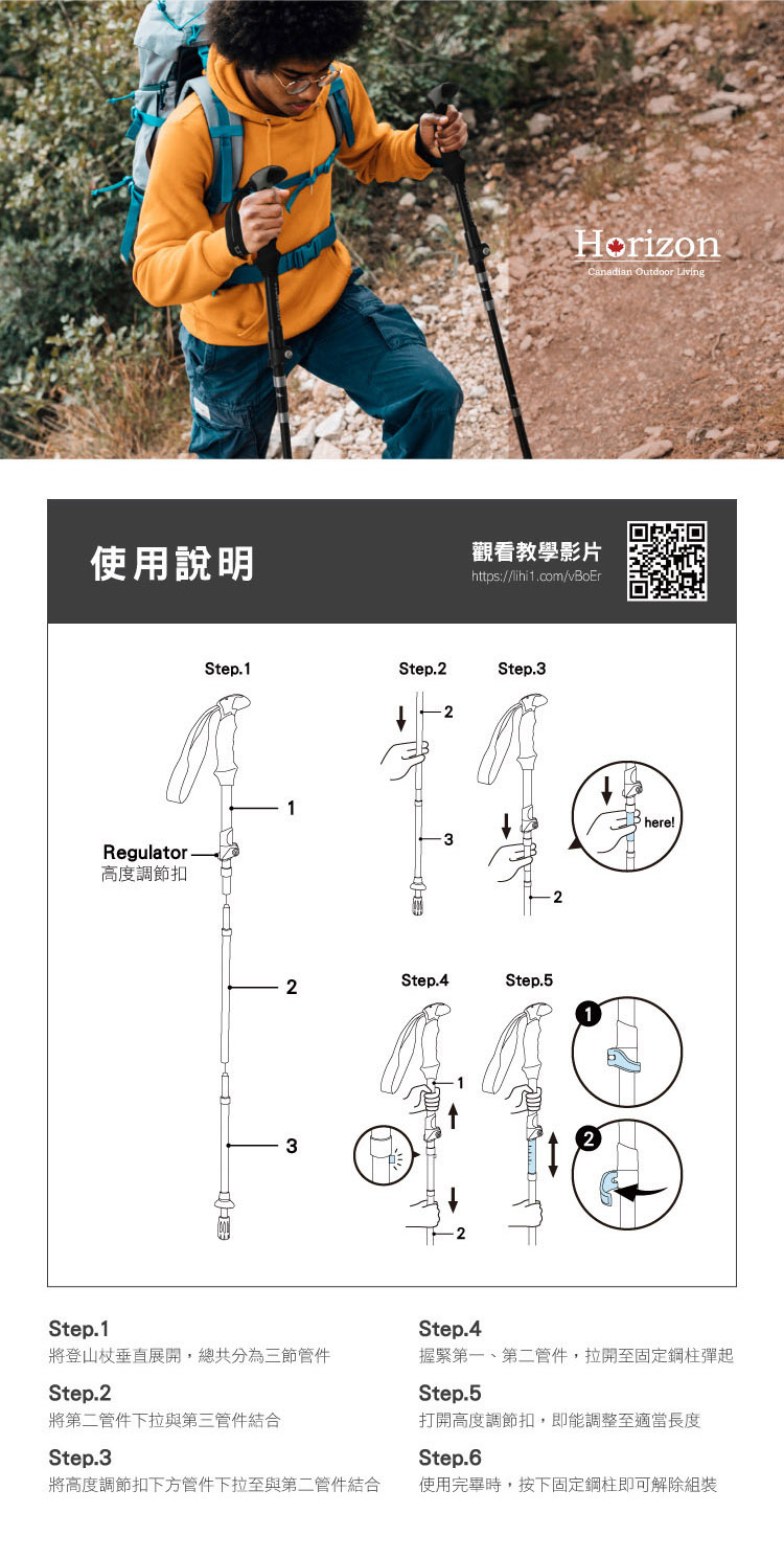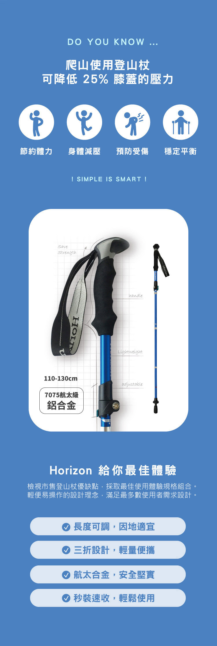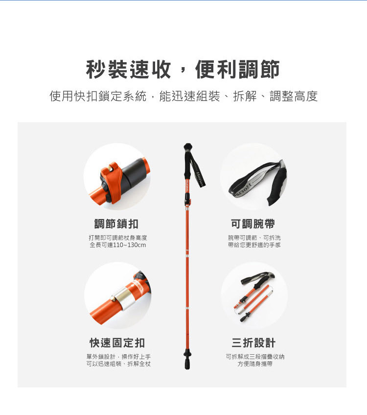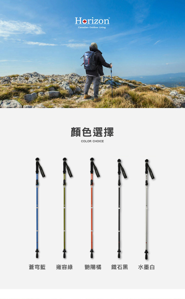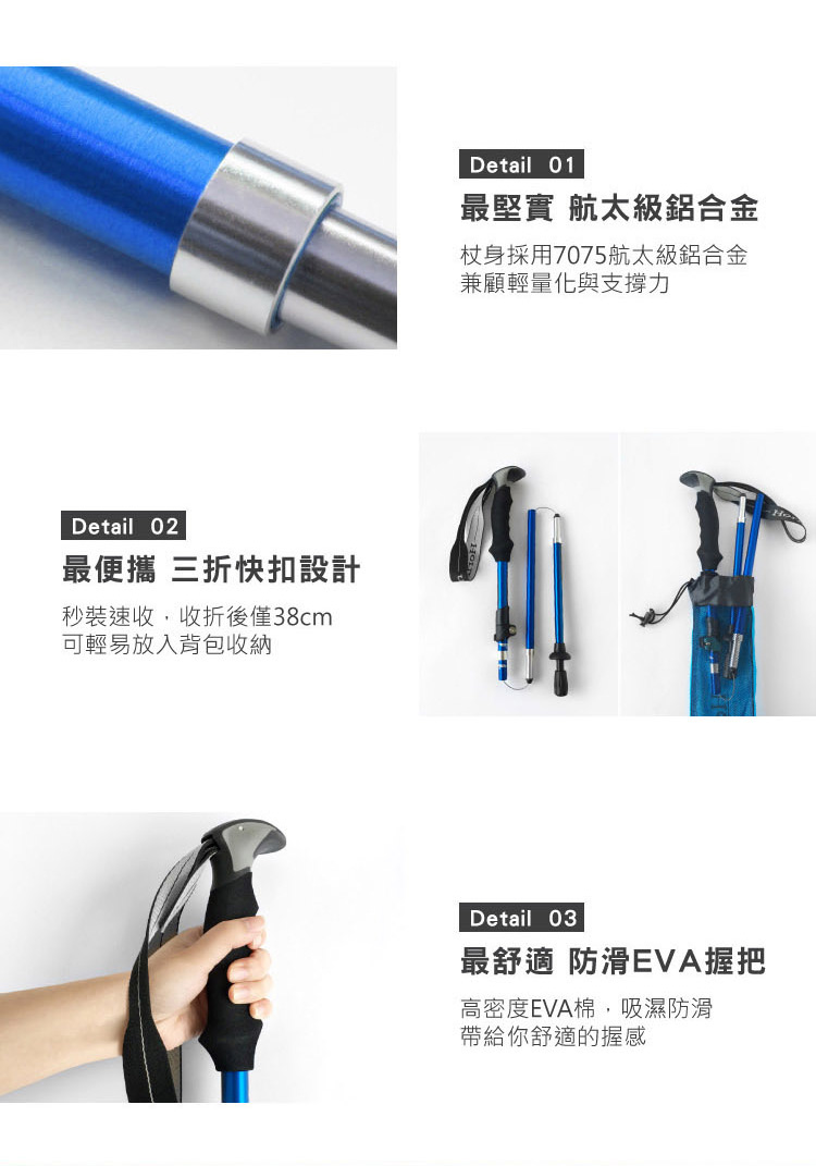 材質 握把:EVA發泡棉/織帶:高密度尼龍/ 杖身:7075航太級鋁合金/杖尖:鎢鋼