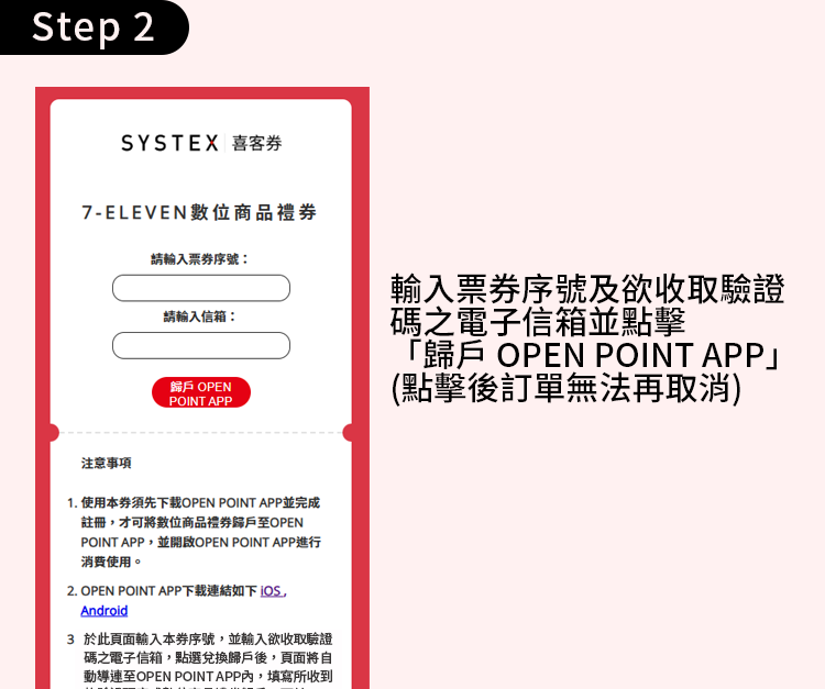 使用本券須先下載OPENPOINT APP並完成註冊,才可將7-ELEVEN數位商品禮券歸戶至OPENPOINT APP,並開啟OPENPOINT APP進行消費使用。