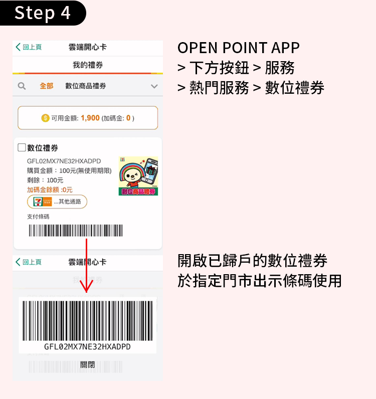 3.使用本券須先下載OPENPOINT APP並完成註冊,才可將數位商品禮券歸戶至OPENPOINT APP,並開啟OPENPOINT APP進行消費使用。