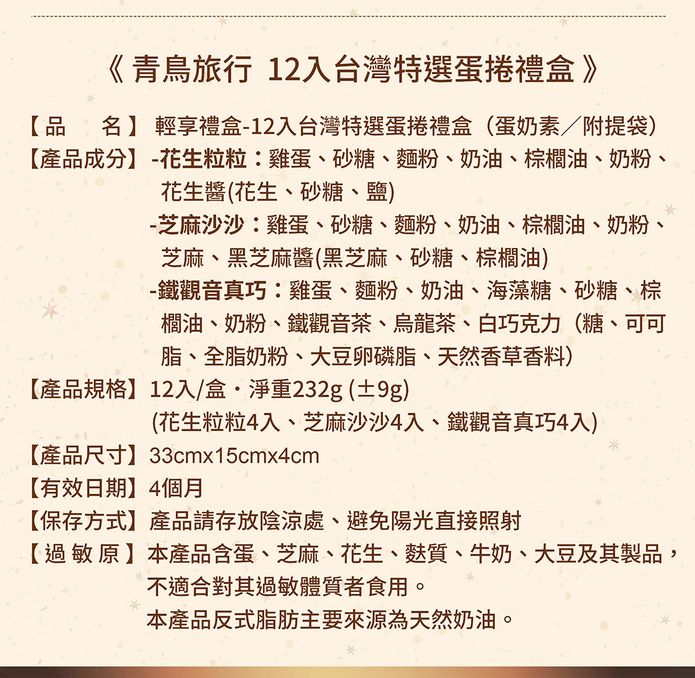 3日內出貨🚚【青鳥旅行】輕享禮盒-台灣特選蛋捲禮盒(12入)|感謝有你