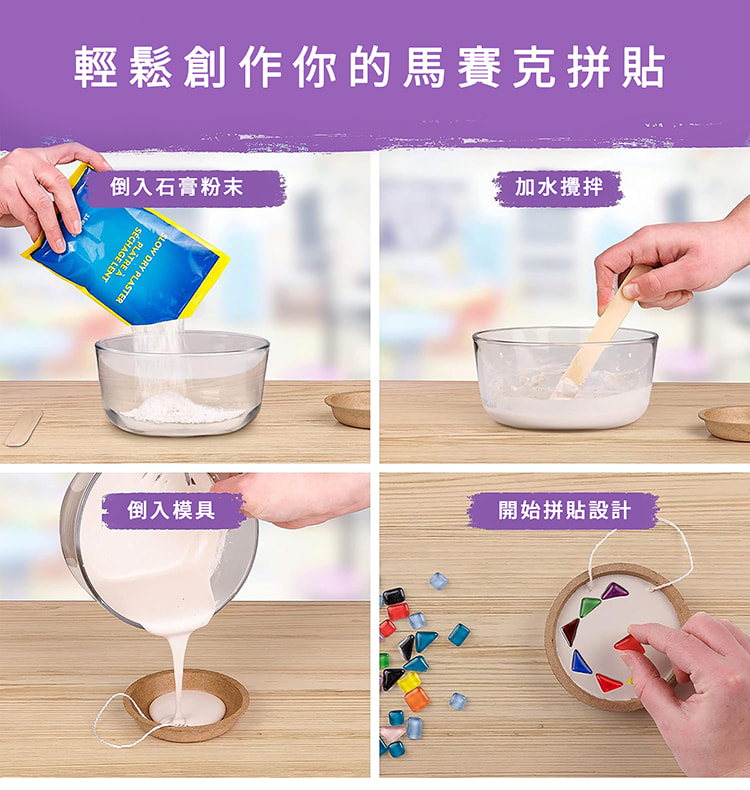 將水混合石膏,倒入模具中,然後將瓷磚依造設計排列好,完成後,可以加上掛繩製成牆面掛飾,或讓它自然晾乾,作為一件驚豔的展示藝術品