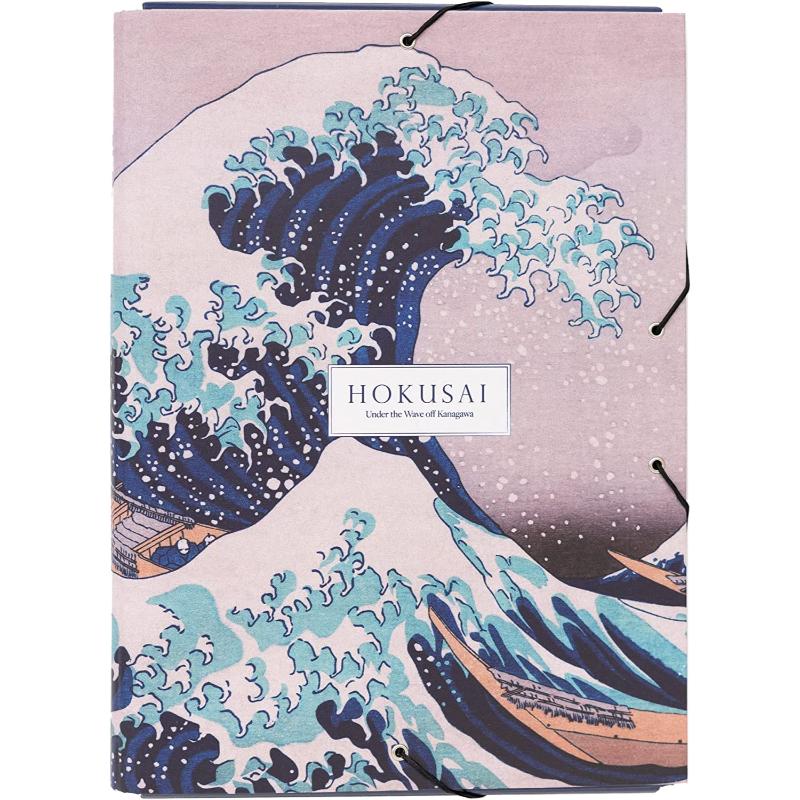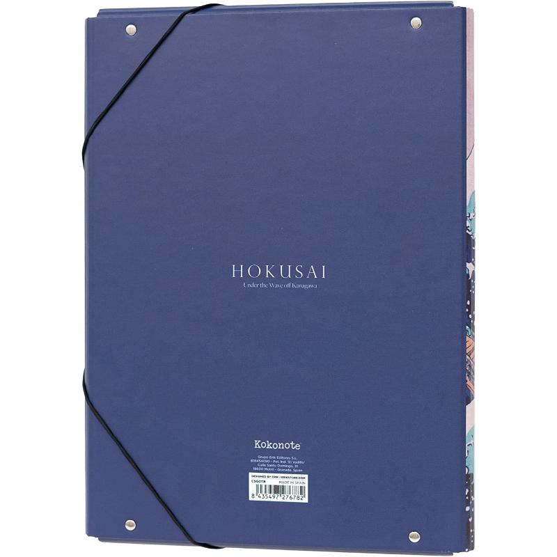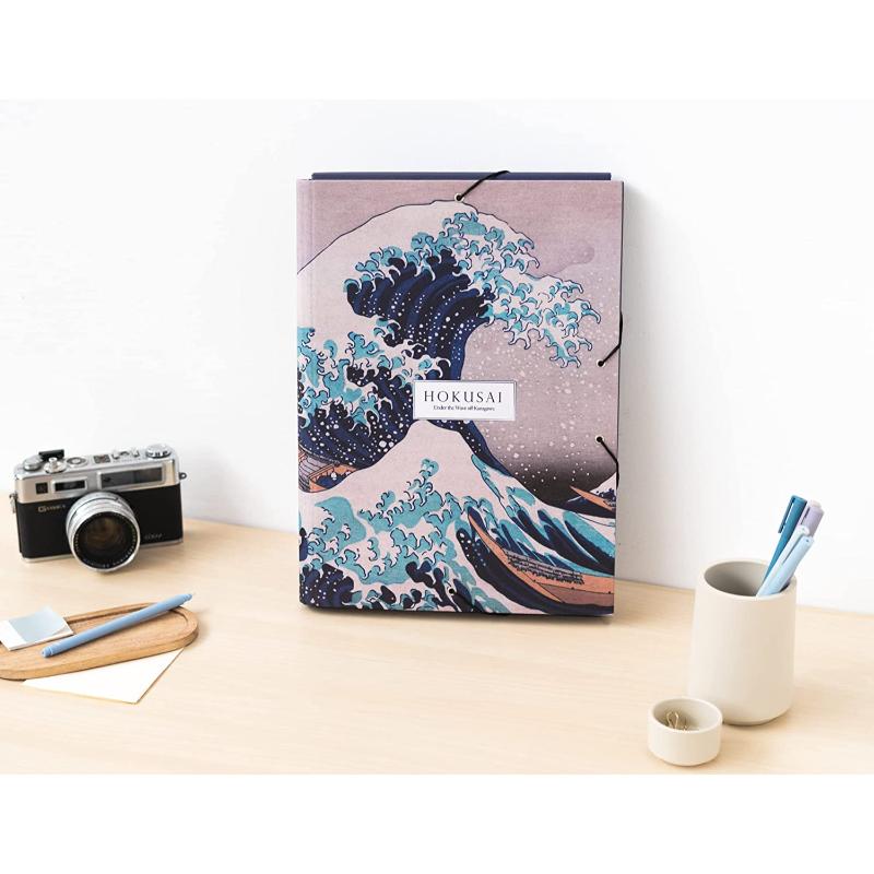 讓經典畫作成為你重要文件的守護神.由KOKONOTE所出品的和風文件夾,以葛飾北齋最為經典的畫作神奈川沖浪裏作為主題.三翻蓋結構設計,讓保護力更加UP,外有綁繩固定文件,不讓文件輕易遺落,尺寸約為24*34cm,適合A4大小紙張