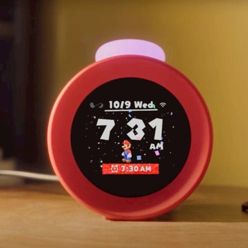 「Nintendo Sound Clock Alarmo」採用任天堂代表作《超級瑪利歐兄弟》主題風格設計,鐘面採用可顯示動態影像的 2.8 吋液晶螢幕,鐘頂設有發光旋鈕。