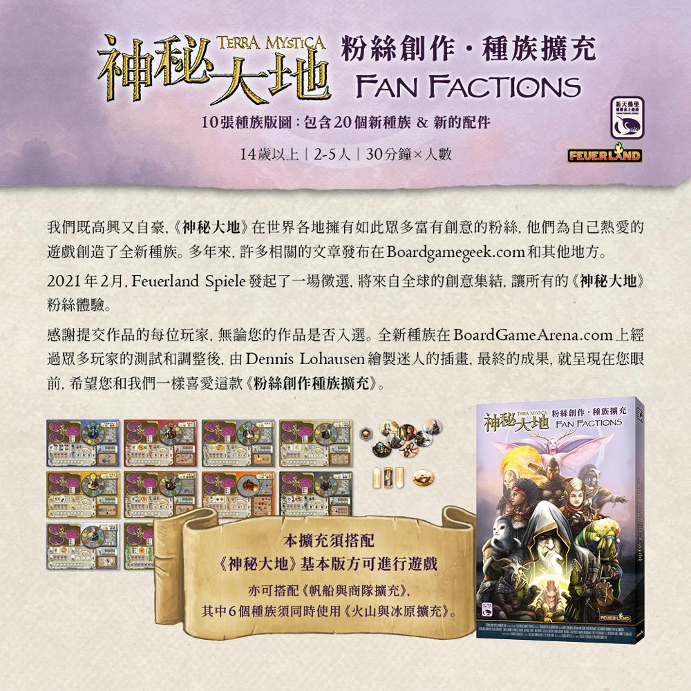 全新種族在 BoardGameArena.com 上經過眾多玩家的測試和調整後,由 Dennis Lohausen 繪製迷人的插畫,最終的成果,就呈現在您眼前,希望您和我們一樣喜愛這款——《粉絲創作種族擴充》。