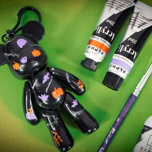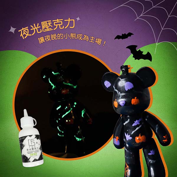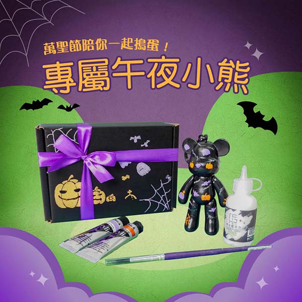 午夜小熊萬聖節套組,除了黑色小熊,還內附橘色及紫色壓克力顏料、一支壓克力用筆以及一罐夜光壓克力,讓您盡情發揮,製作出專屬於自己的午夜小熊,與您一同在萬聖夜閃亮登場。