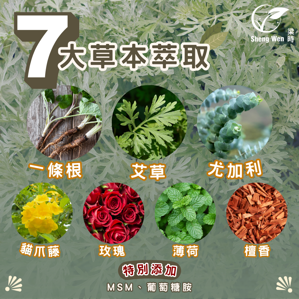 ◉成分:貓爪藤萃取物、甲基硫醯基甲烷(MSM)、葡萄糖胺、一條根(闊葉大豆)萃取物、艾草萃取物、玫瑰香精、薄荷精油、尤加利精油、檀香香精、樹脂、食用色素