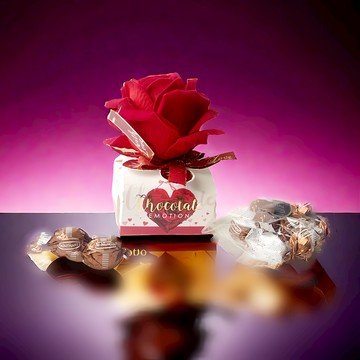 - 立體玫瑰花造型外盒搭配愛心款牛奶巧克力,適合送給最親密的愛人。