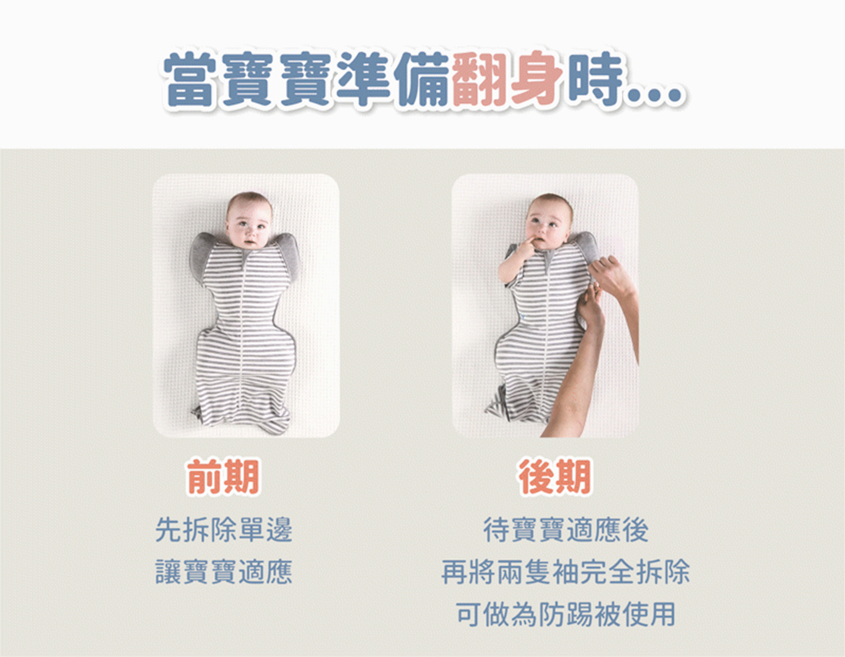 - 可拆袖式包巾,有翻身跡象或會翻身寶寶使用