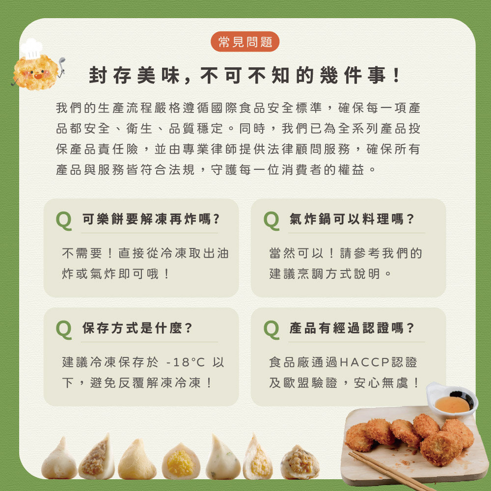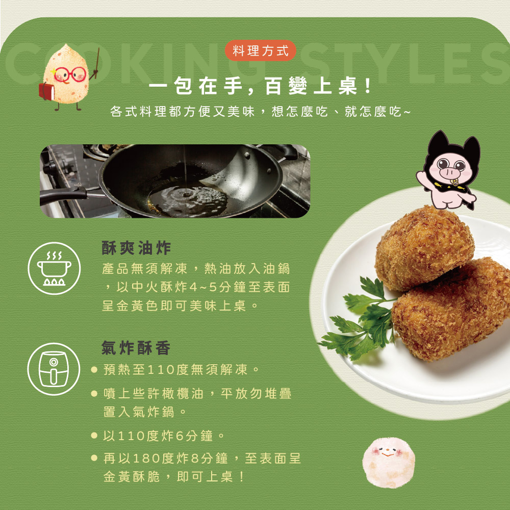 氣炸-預熱至110度無須解凍噴上些許橄欖油,平放勿堆疊置入氣炸鍋,以110度炸6分鐘再以180度炸8分鐘至表面呈金黃酥脆,即可美味開動!